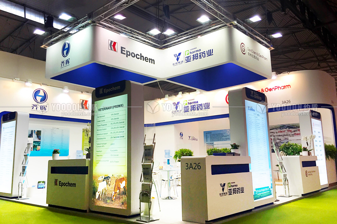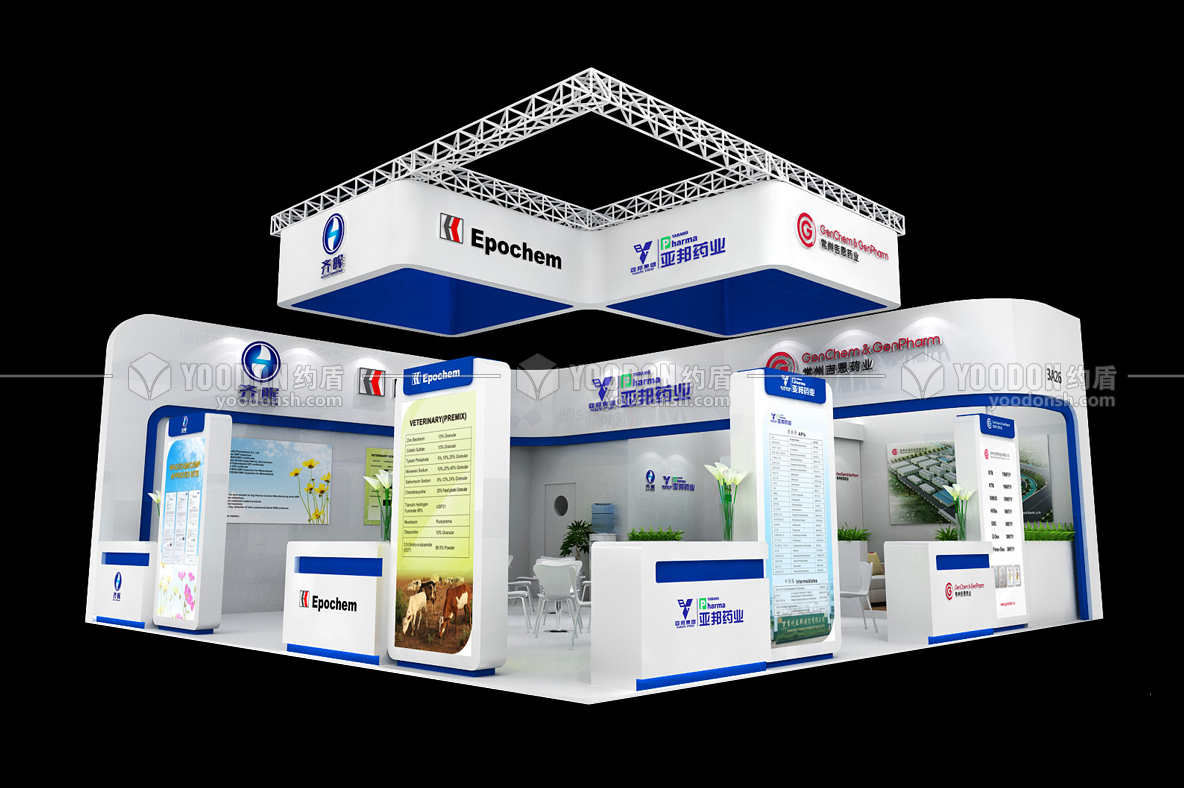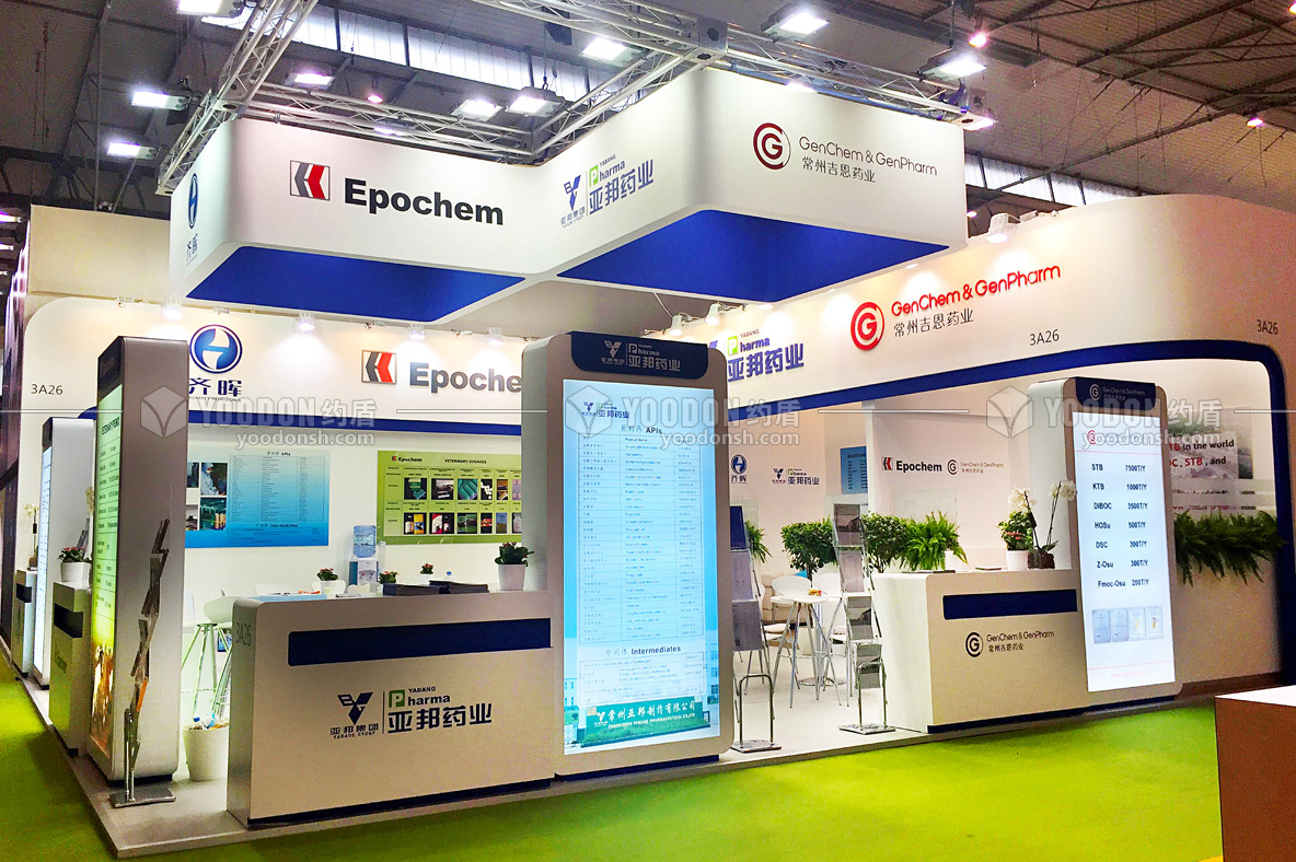 亞邦藥業是一家科工貿一體化的新興醫藥集團,此次參加瑞士展會,會展設計搭建的主題色彩以天藍色為主,兩面開口設計,兩面開口處是企業產品介紹的海報設計。