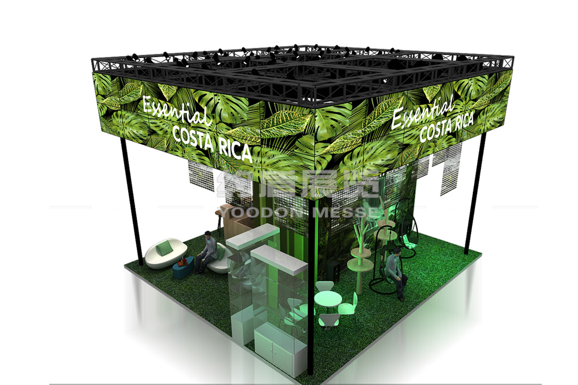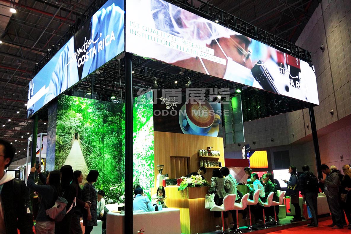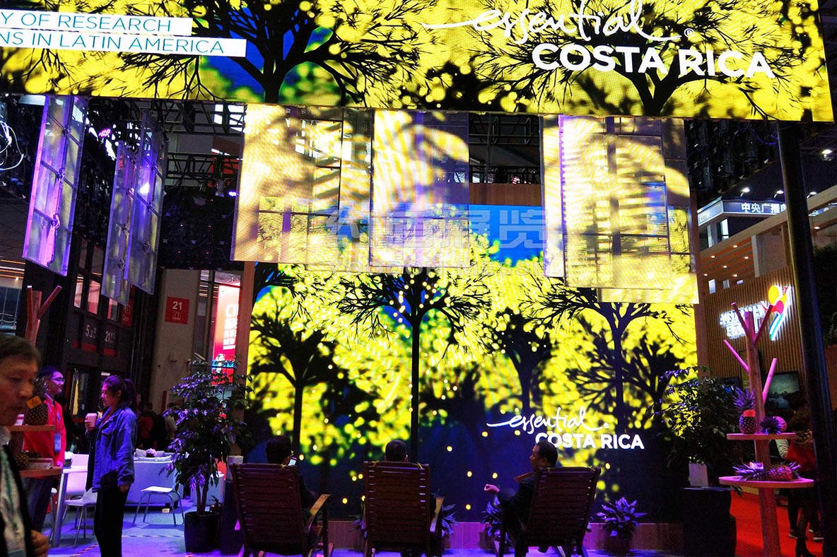 展臺(tái)的頂部我們選用了高清的P2.5 LED 屏幕,循環(huán)播放哥斯達(dá)黎加的自然風(fēng)情.全LED展示也是近來(lái)上海展會(huì)設(shè)計(jì)的一個(gè)潮流和風(fēng)尚.