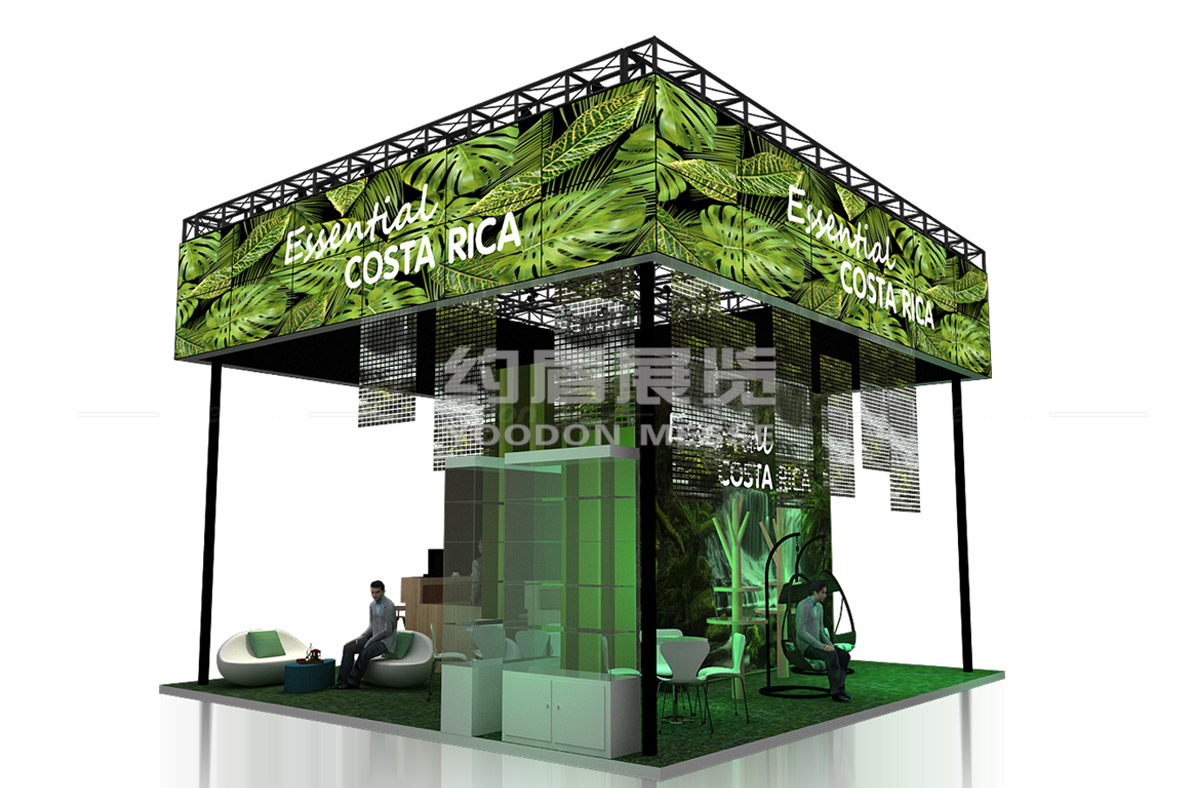 同時(shí)在展臺(tái)的中央位置,我們也錯(cuò)落有致的懸吊了高科技的透明冰屏,用來(lái)模仿哥斯達(dá)黎加秀麗的瀑布.這在上海展臺(tái)設(shè)計(jì)之中也是一大亮點(diǎn).