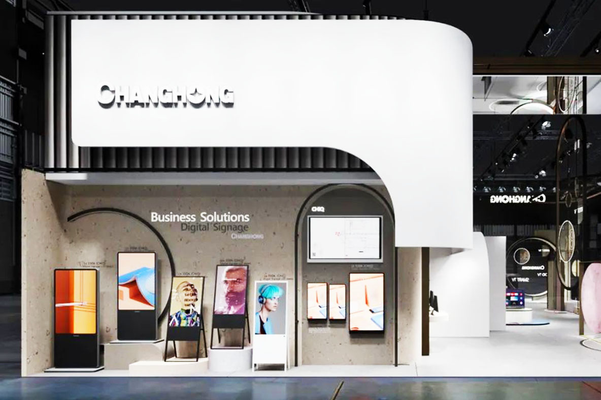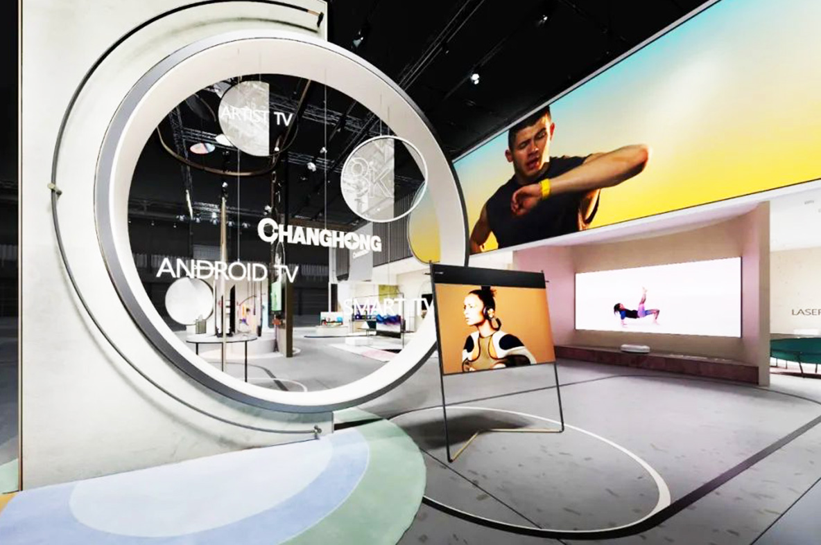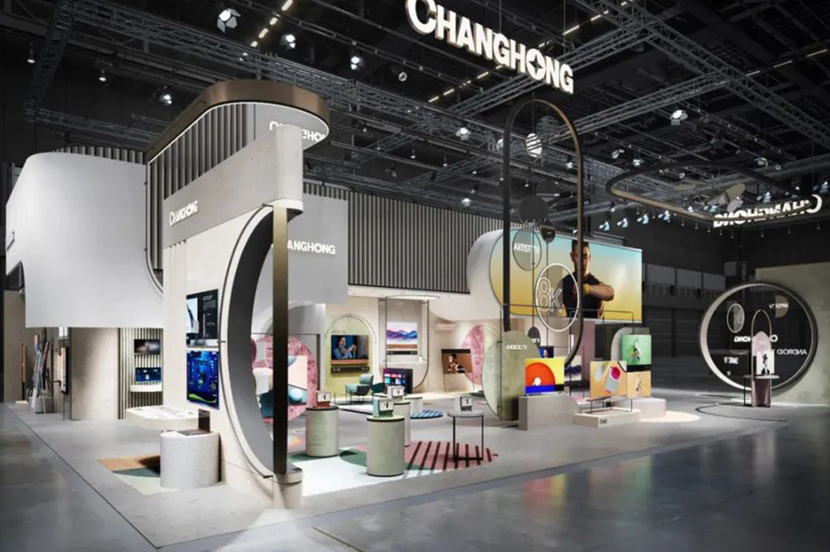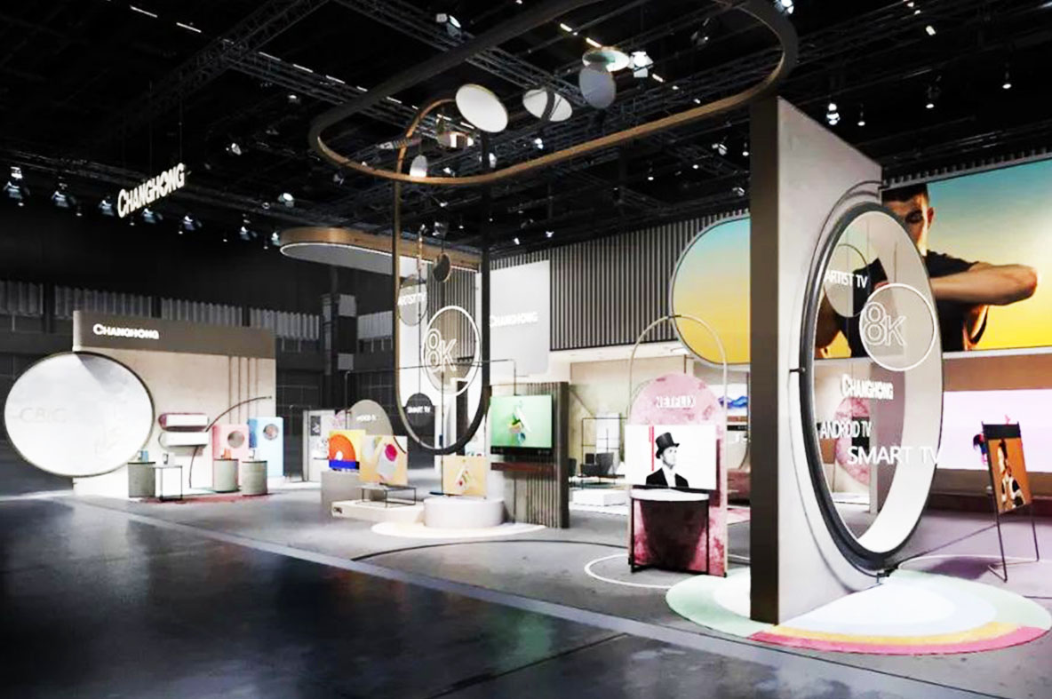 今天給大家分享一個來自長虹企業2019IFA的展臺設計案例,該展臺為三面開口式設計,展位大部分都設置為展示區,根據不同產品類型設計不同展示手法和環境。